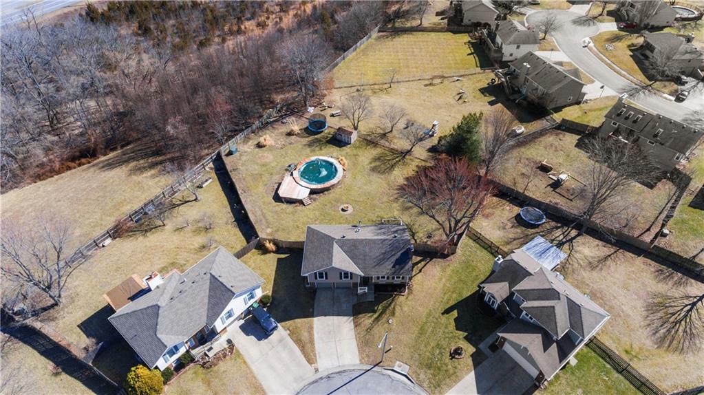 Spacious, versatile, and packed with outdoor amenities, this 4-bedroom, 2.5-bath split-level home sits on a quiet cul-de-sac in a sought-after Blue Springs neighborhood. With multiple living areas and a functional layout, the home offers flexibility for growing households, work-from-home needs, or multi-generational living. The main level features a light-filled living room, formal dining area, and eat-in kitchen with ample cabinet and counter space. Two fireplaces add warmth and character, while the finished lower level provides additional living space ideal for a media room, playroom, or home office. The primary suite includes a private bath with double vanities and generous closet space, while three additional bedrooms offer room for guests, hobbies, or workspace flexibility. Step outside to a fully fenced, cul-de-sac lot backing to trees, designed for entertaining and relaxation. Highlights include an above-ground pool with surrounding deck, utility shed, and fire pit, creating a private backyard retreat rarely found at this price point. Additional features include a two-car attached garage, and convenient access to parks, lakes, shopping, dining. Located near Lake Jacomo and Blue Springs Lake and the highly rated attendance schools of Cordell Mason Elementary, Moreland Ridge Middle and Blue Springs South High Schools. A rare combination of space, outdoor living, and location in the heart of Blue Springs.
